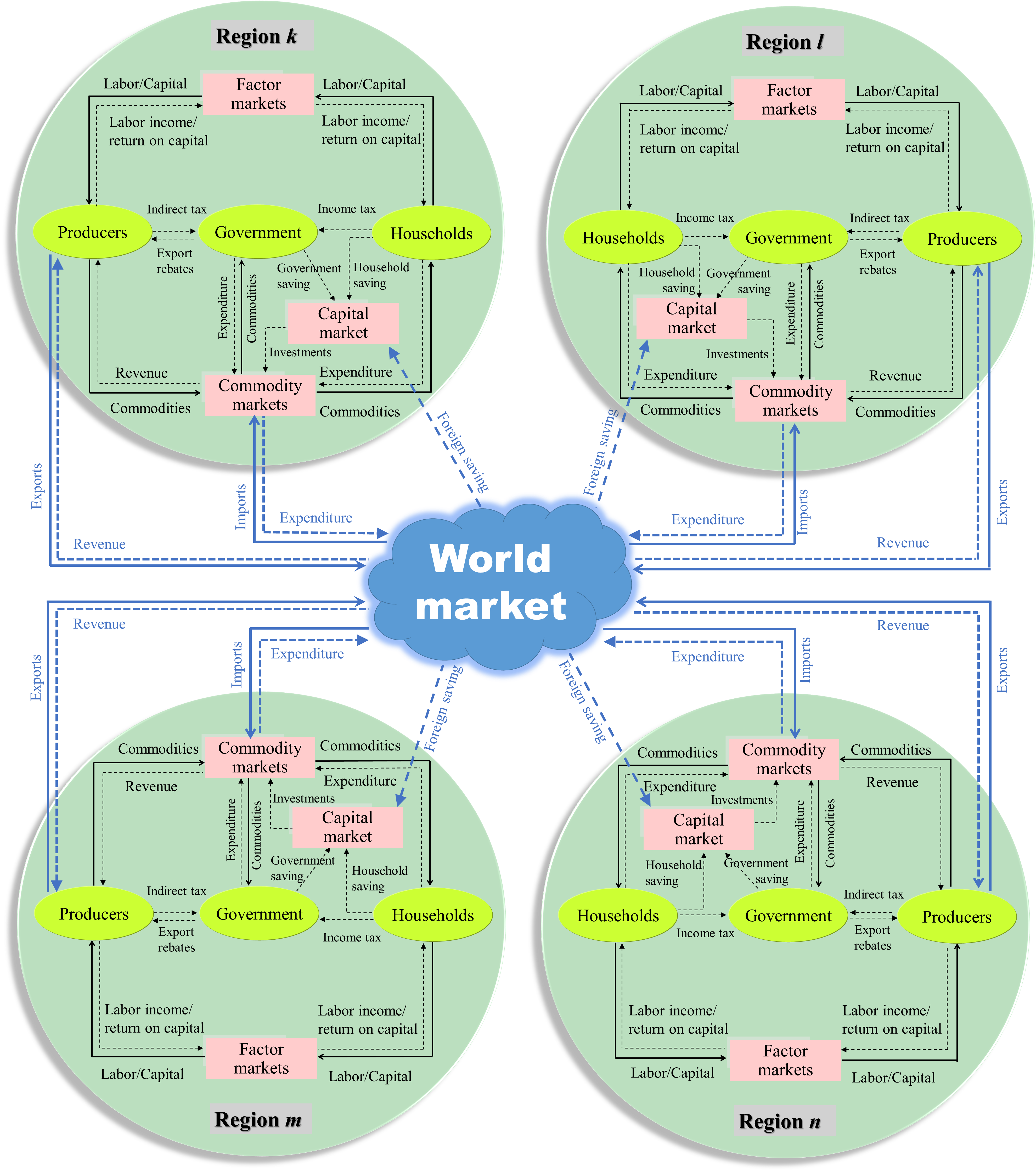 该研究采用的研究工具是魏一鸣教授团队自主设计开发的中国气候变化综合评估模型(C3IAM)中的经济模块—全球能源和环境政策分析模型(GEEPA)。C3IAM模型耦合了地球系统模式与社会经济系统,是评估气候政策的关键工具,也是中国唯一入选联合国气候变化专门委员会第六次评估报告(IPCCAR6)的全球综合评估模型。GEEPA是一个全球多区域递归动态可计算一般均衡模型,不仅覆盖了全球经济增长、产业结构、投资消费、能源消耗等社会经济要素的变化,而且还通过引入温室气体和污染物排放模块,可用于测算经济活动对环境的影响,包括环境排放、辐射强迫、温升等。