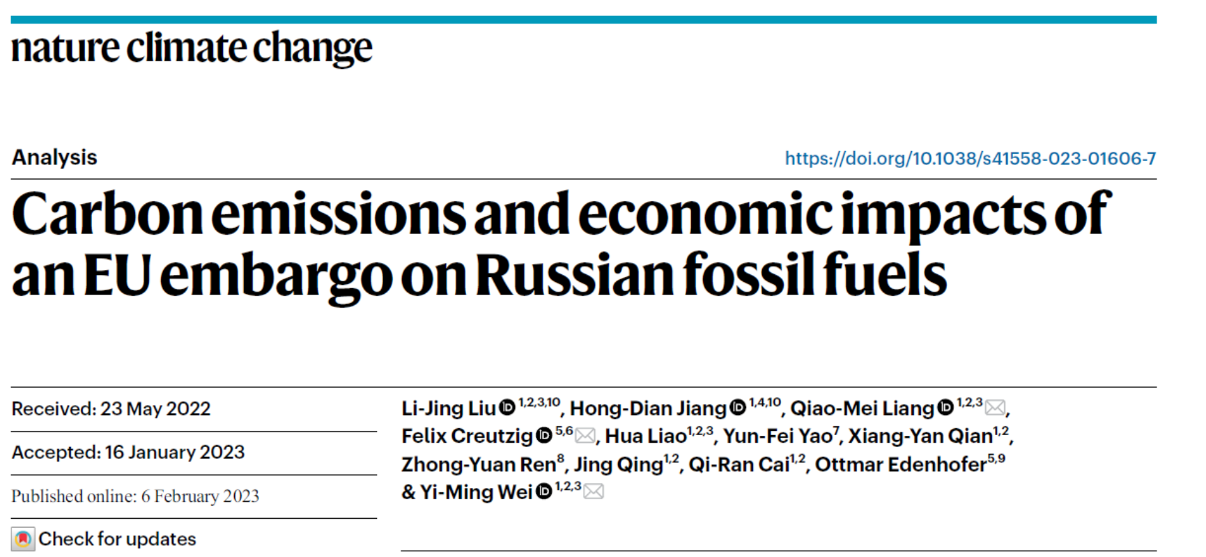 Liu, LJ., Jiang, HD., Liang, QM.et al.Carbon emissions and economic impacts of an EU embargo on Russian fossil fuels.Nat. Clim. Chang.(2023). http://doi.org/10.1038/s41558-023-01606-7